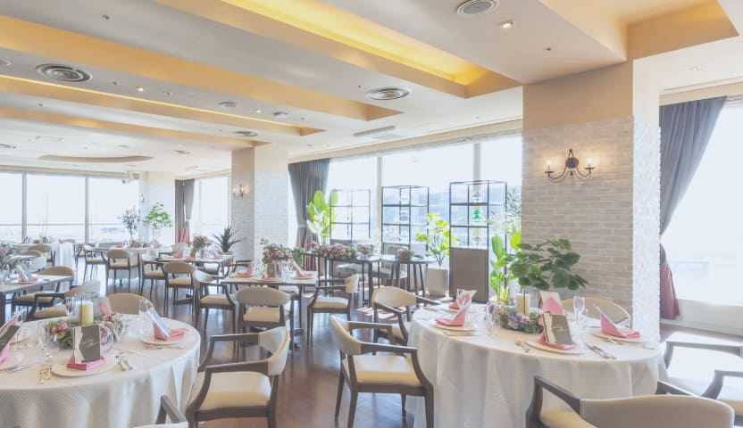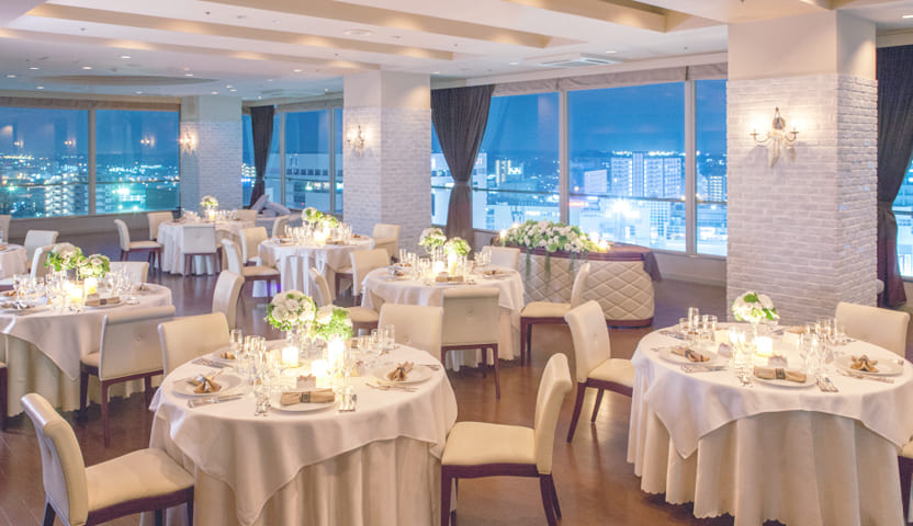 ホテル最上階に位置し、180度の窓からは水戸市街を一望できる開放感あふれる会場。乾杯と同時に広がる景色も、ゲストへのおもてなしのひとつ…