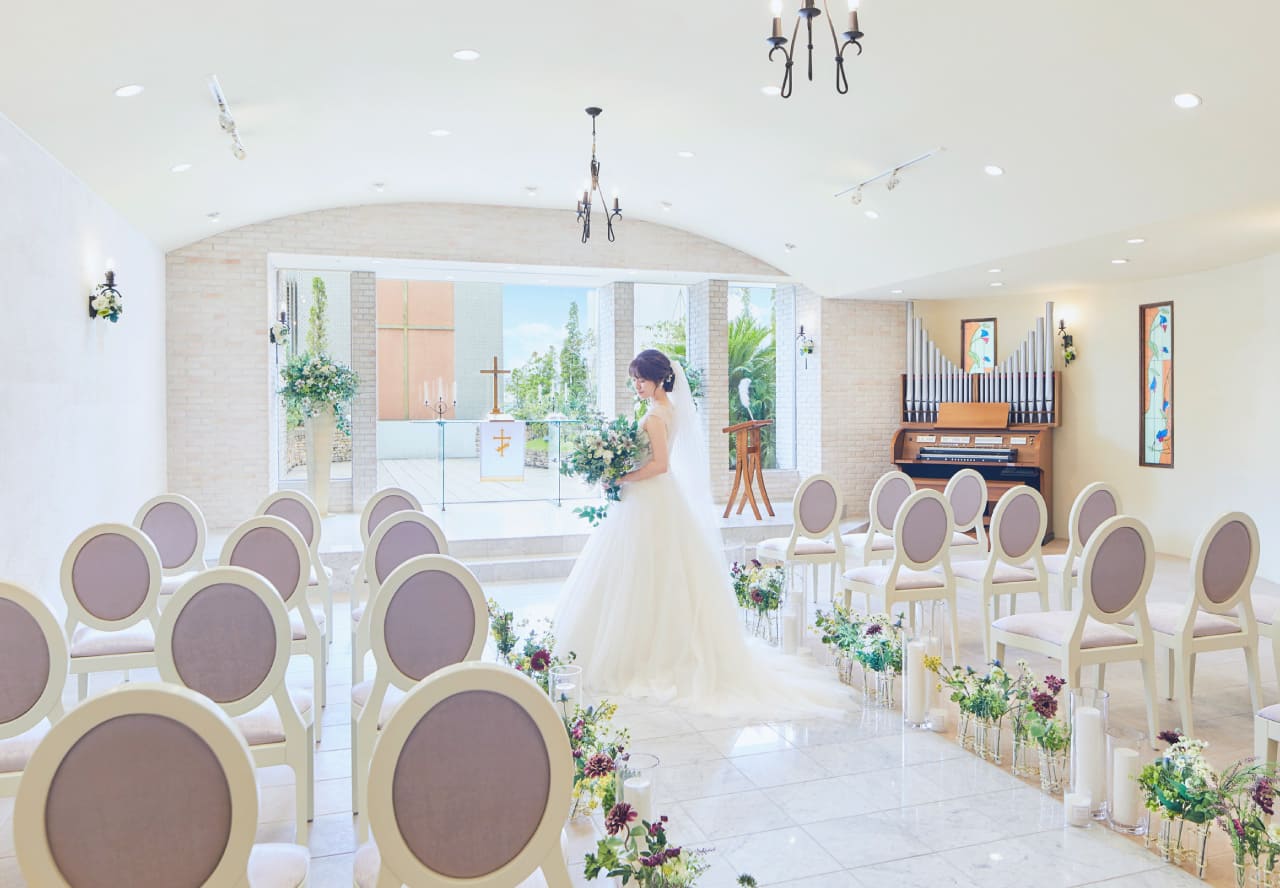 自然光の入るあたたかいチャペルでおこなう教会式。